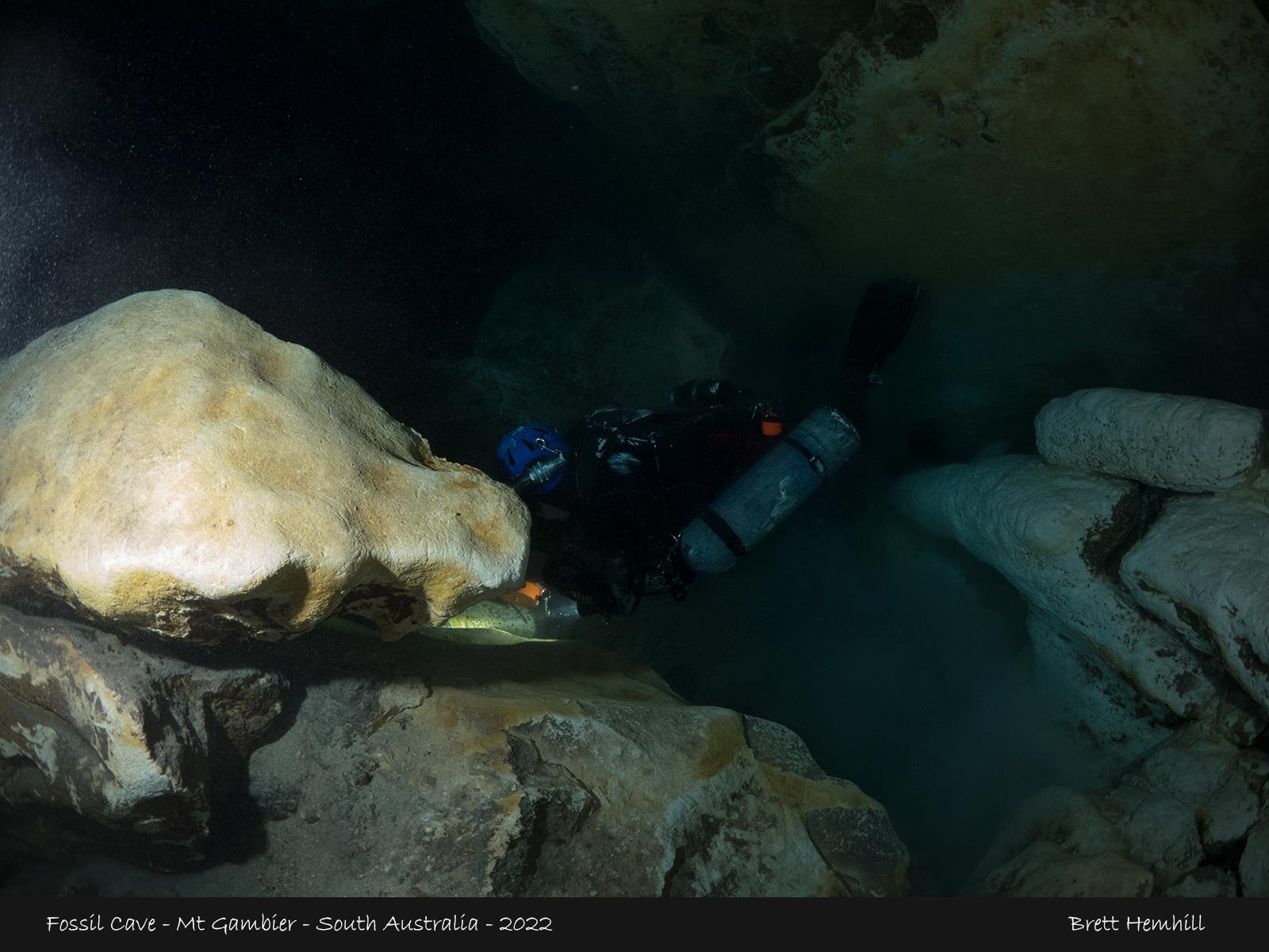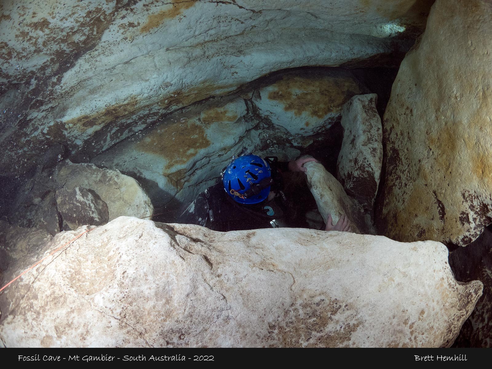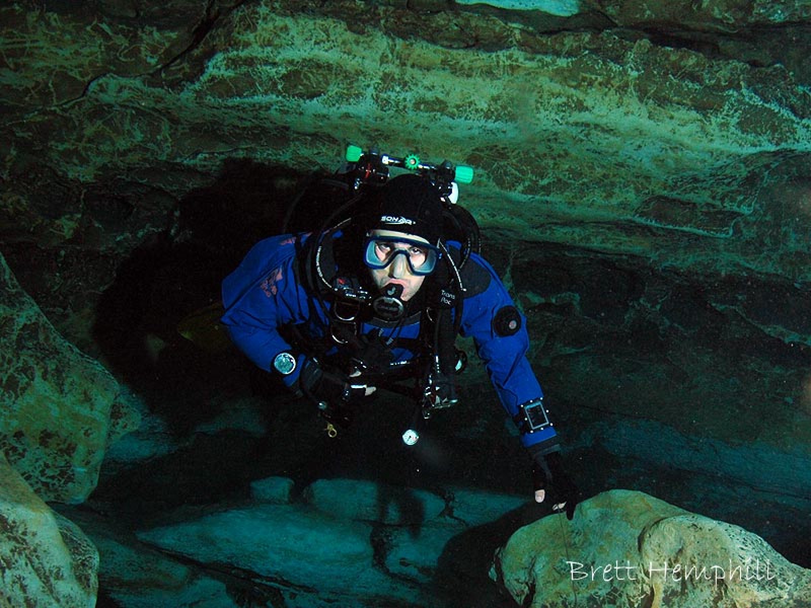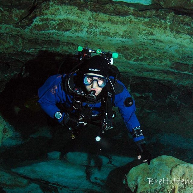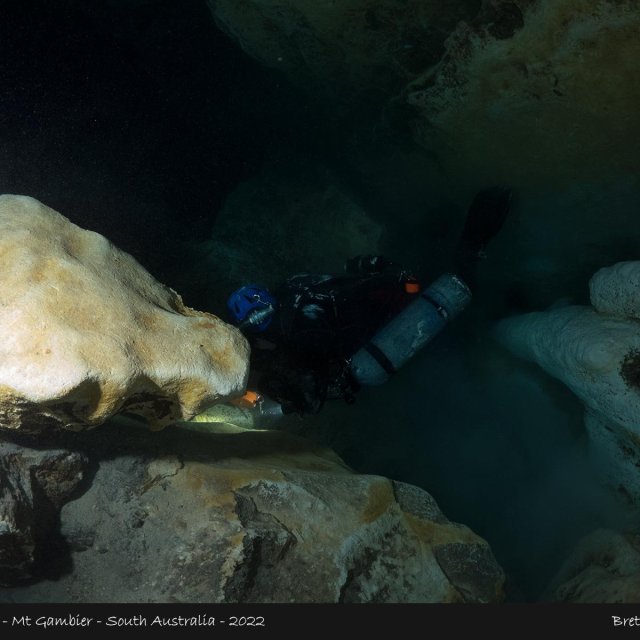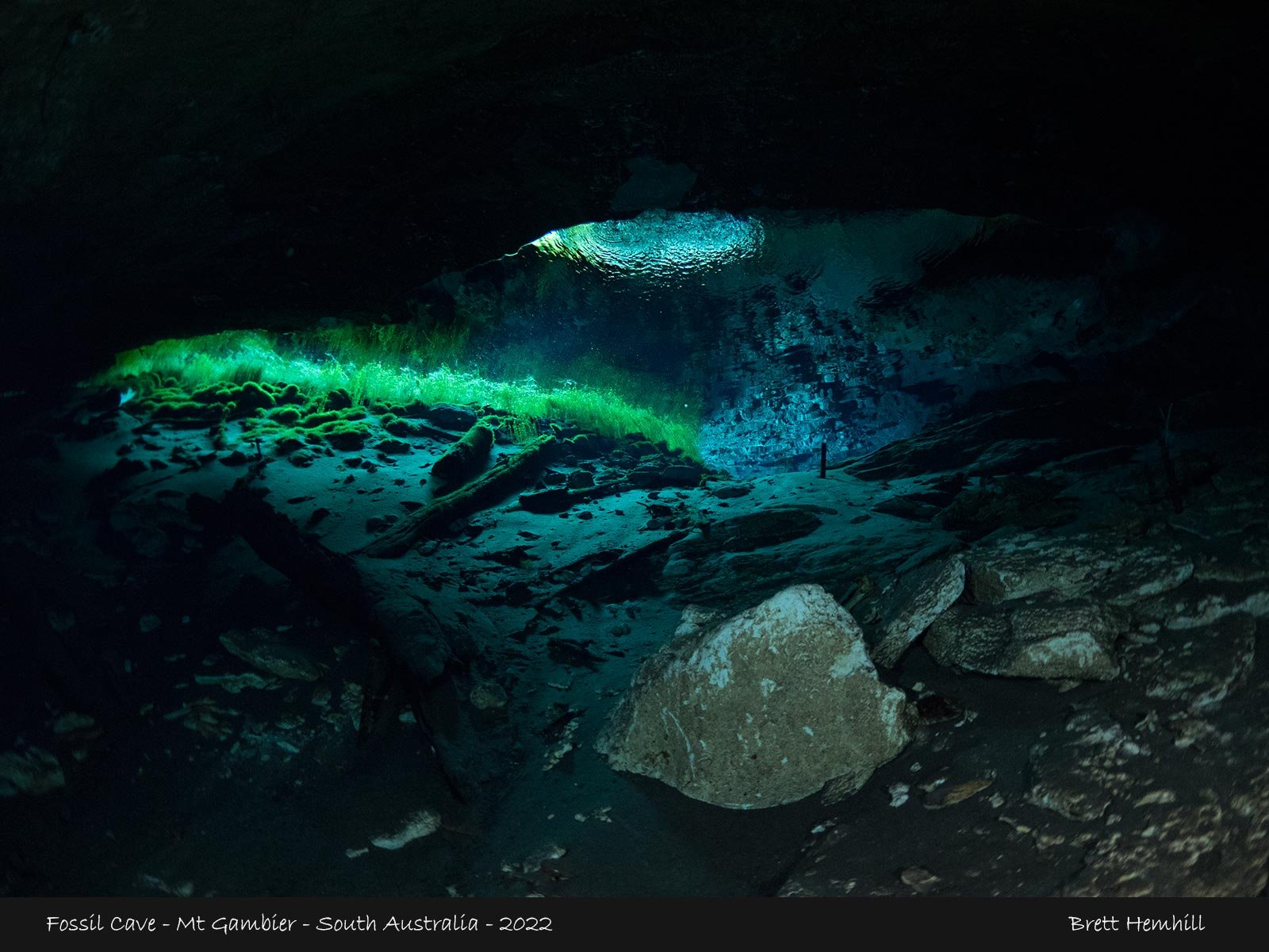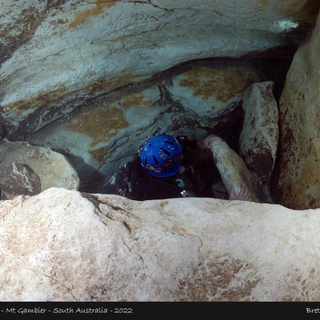 The entrance is a small and is easily silted, this then leads to a broad chamber with dark silt at the bottom. This provides an excellent view of the surface again with brilliant green and blue colours.