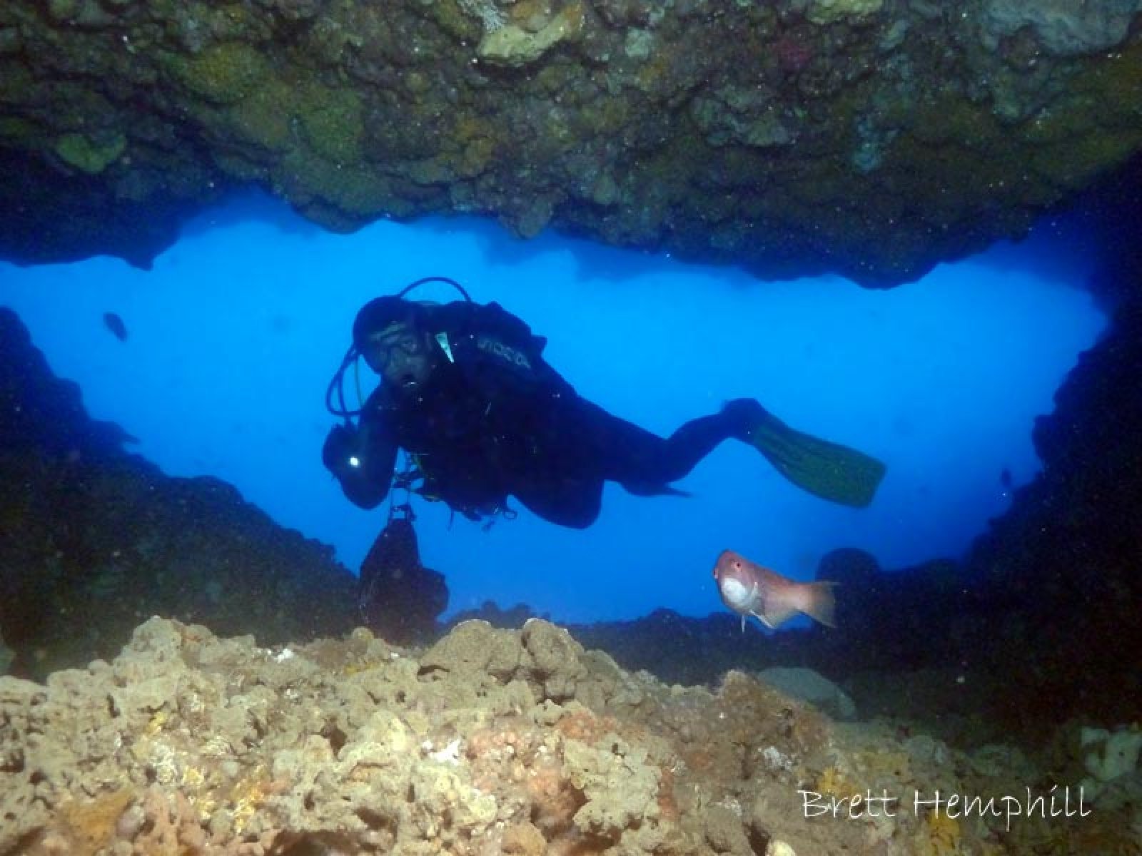 Cute little cave with an entrance around 22M and the exit at 30M. It is easy swim through for advanced divers. The entrance usually supports many fish and the deeper exit is the start of the wall so you can explore as much as you like.