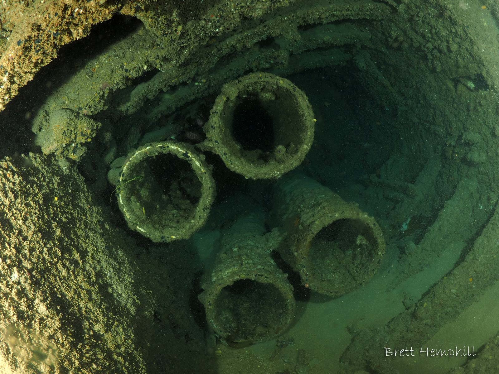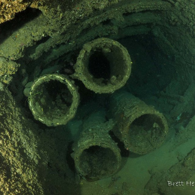 The bow is broken away and provides easy access to inspect the torpedo tubes (see gallery). There is a plaque on the sub near the conning tower which was placed by the group of divers who re-discovered it.