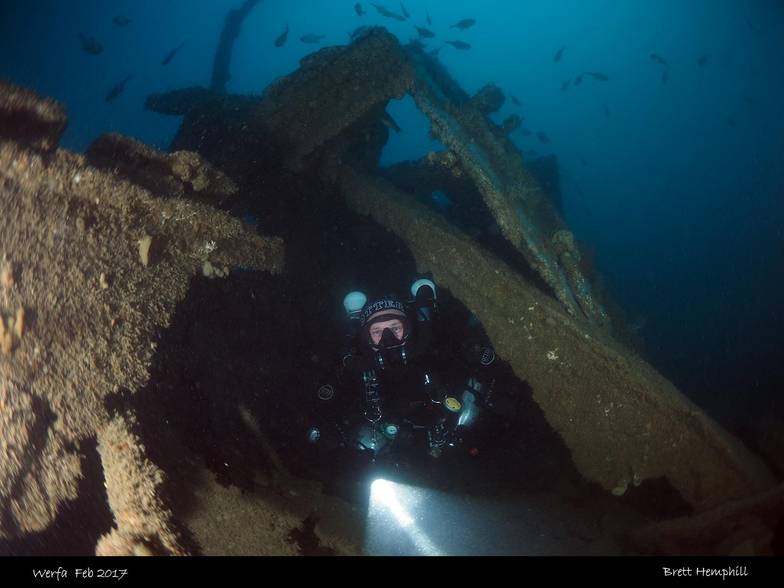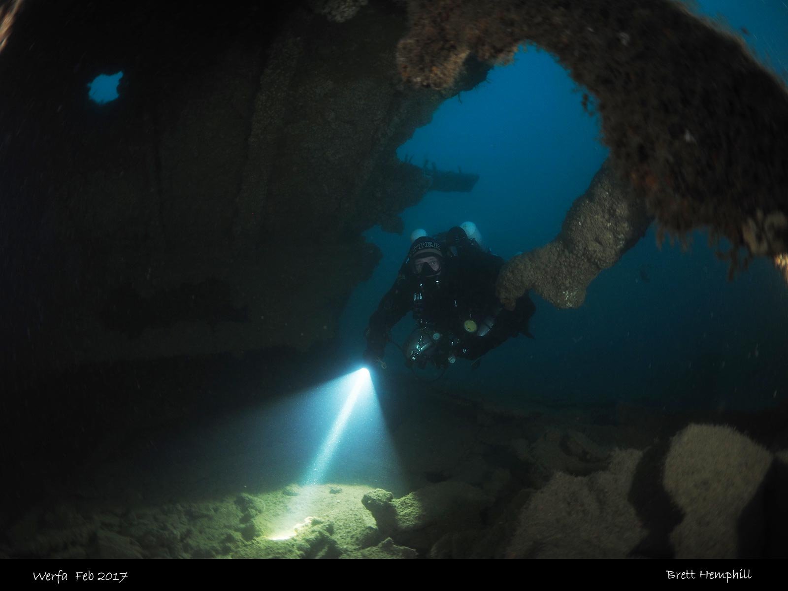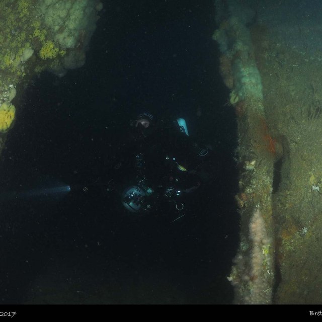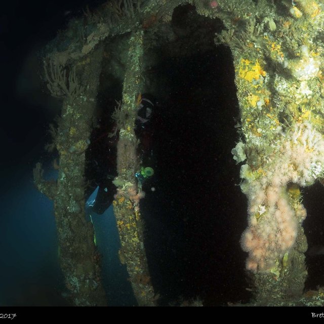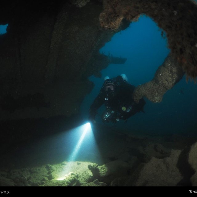There are many swim throughs on the wreck, the stern is quite distinct with iron rectangles. You can go down to the stern to investigate the rudder which is fully intact.