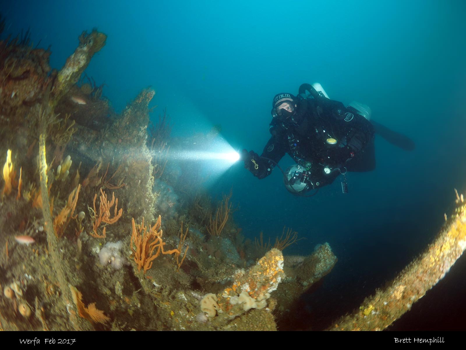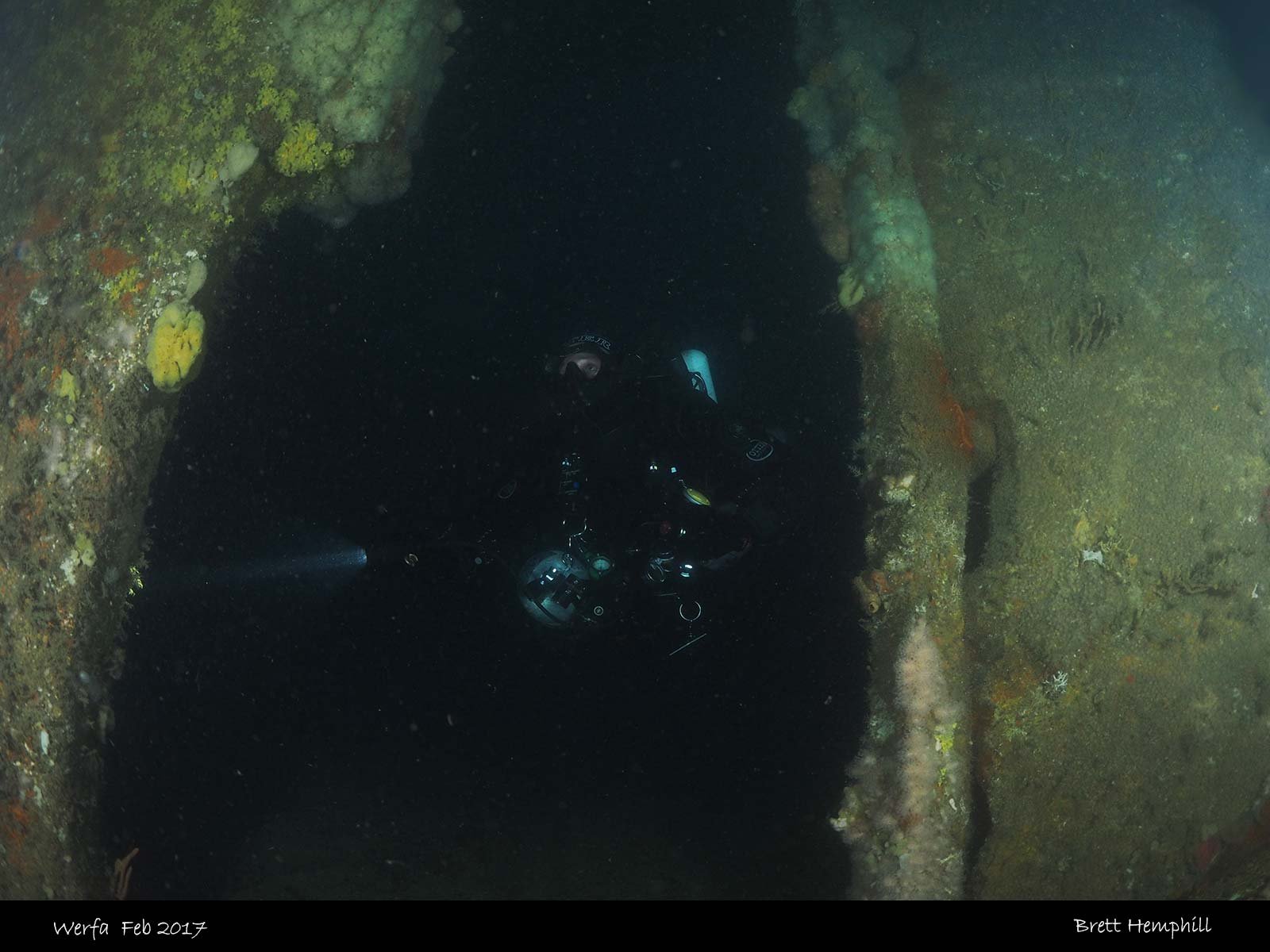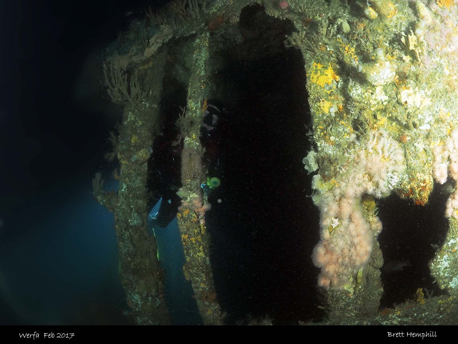 There are many swim throughs on the wreck, the stern is quite distinct with iron rectangles. You can go down to the stern to investigate the rudder which is fully intact.